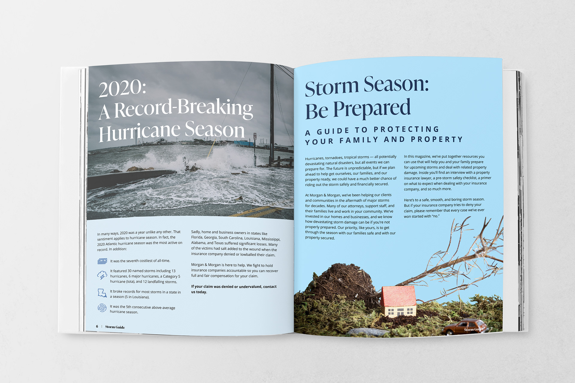 This magazine educates, informs and gives people the proper tools for navigating through storm season and what steps to take in the event a storm impacts them/their family. Morgan & Morgan clients will receive this magazine via direct mail. Contribution: Worked as lead designer on this magazine to conceptualize, design layout and create imagery. Other contributors: Nicole Monzon (Senior Art Director), Dov Drelich (Project Manager), Tom Greenhalgh (Copywriter), Amanda Vigdor (Junior Graphic Designer)